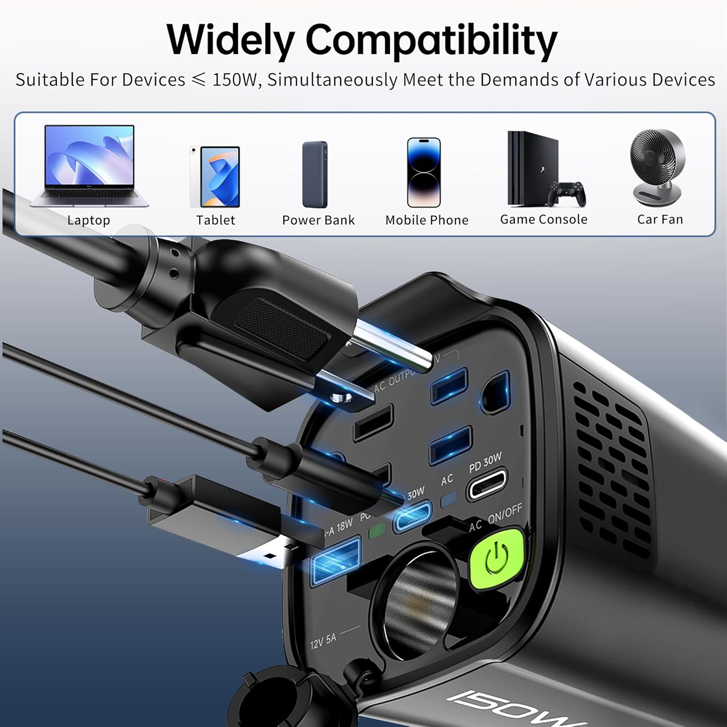 【6-in-1 Versatile Car Power Inverter for All On-the-Go Needs】This 6-in-1 multi car power converter is equipped with 2 DC 12V to AC 110V U.S. standard AC outlets (Total 150W) + dual USB-C PD ports (30W each) + QC3.0 18W USB-A port + 12V 5A (10A Max) cigarette lighter plug adapter, perfect for charging electronic devices such as laptops, tablets, cell phones, Christmas gifts, light strings and so on.