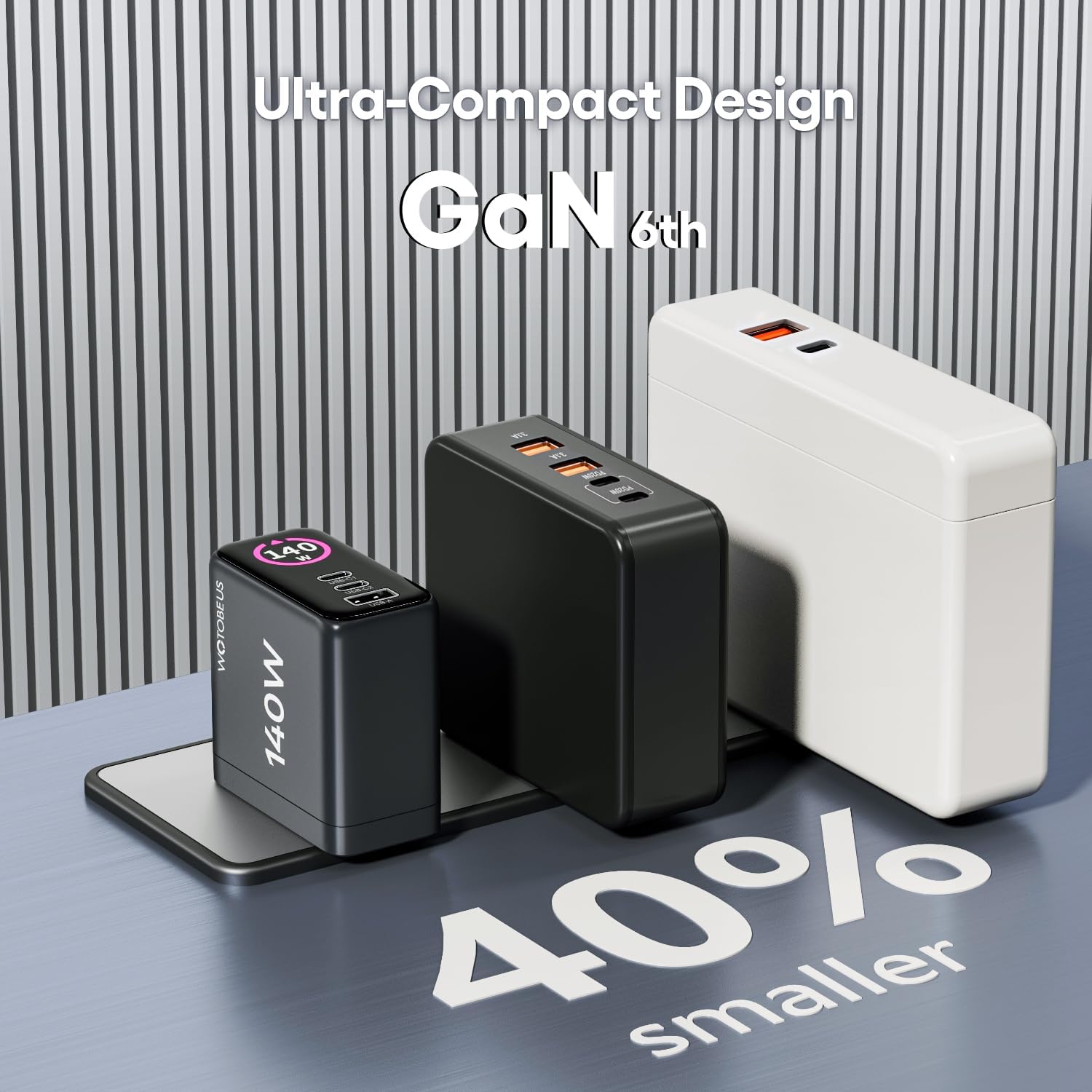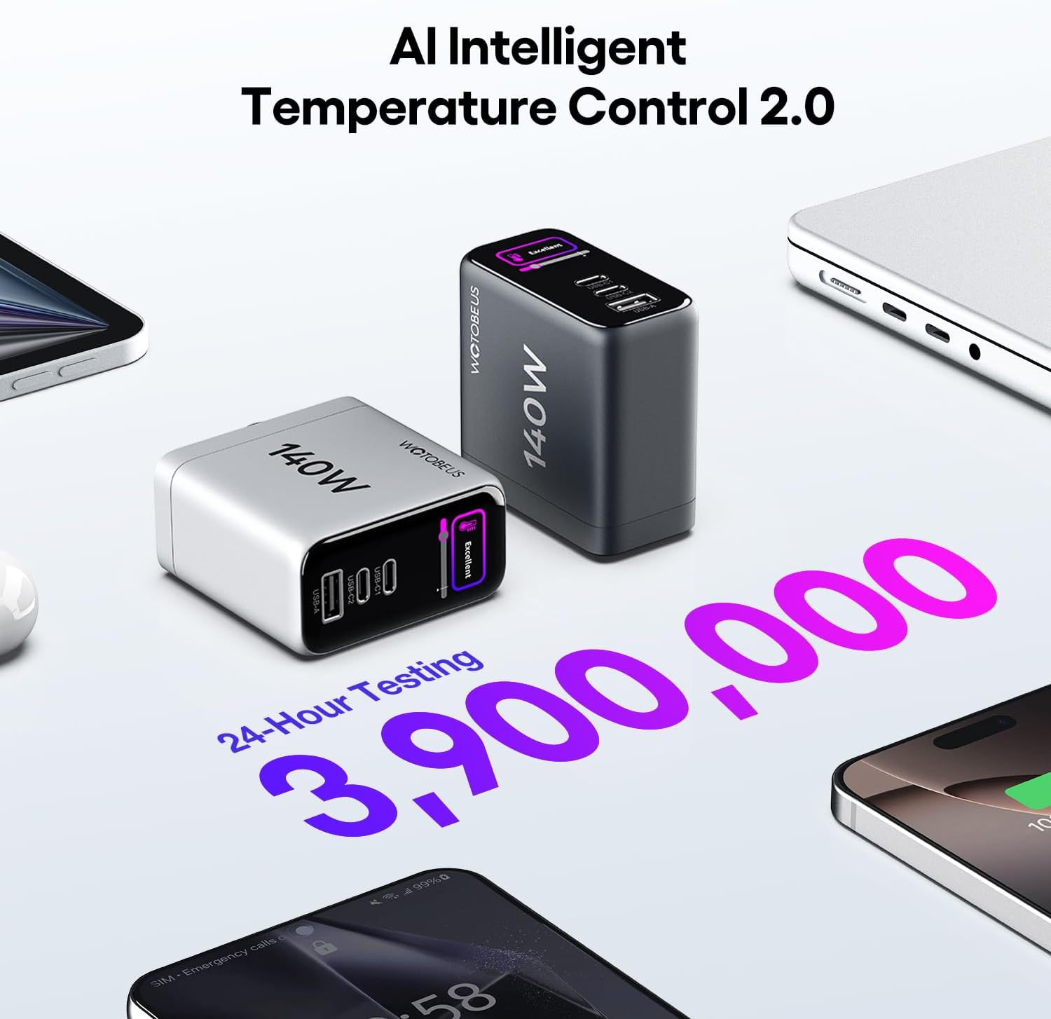 GaN 6 Chip + Advanced Heat Management – GaN 6 Chip + AI Temp Control: The WOTOBEUS 140W USB-C GaN wall charger block uses 6th-generation gallium nitride technology to deliver efficient power, reduce energy loss, and keep size compact. Its upgraded AI intelligent temperature control system runs 24/7 to prevent overheating, protect device batteries, and ensure stable, balanced power delivery across all ports. Enjoy cooler charging, overheat protection, and a longer charger lifespan—ideal for workstations, travel bags, and always-on charging setups where reliable GaN performance matters most