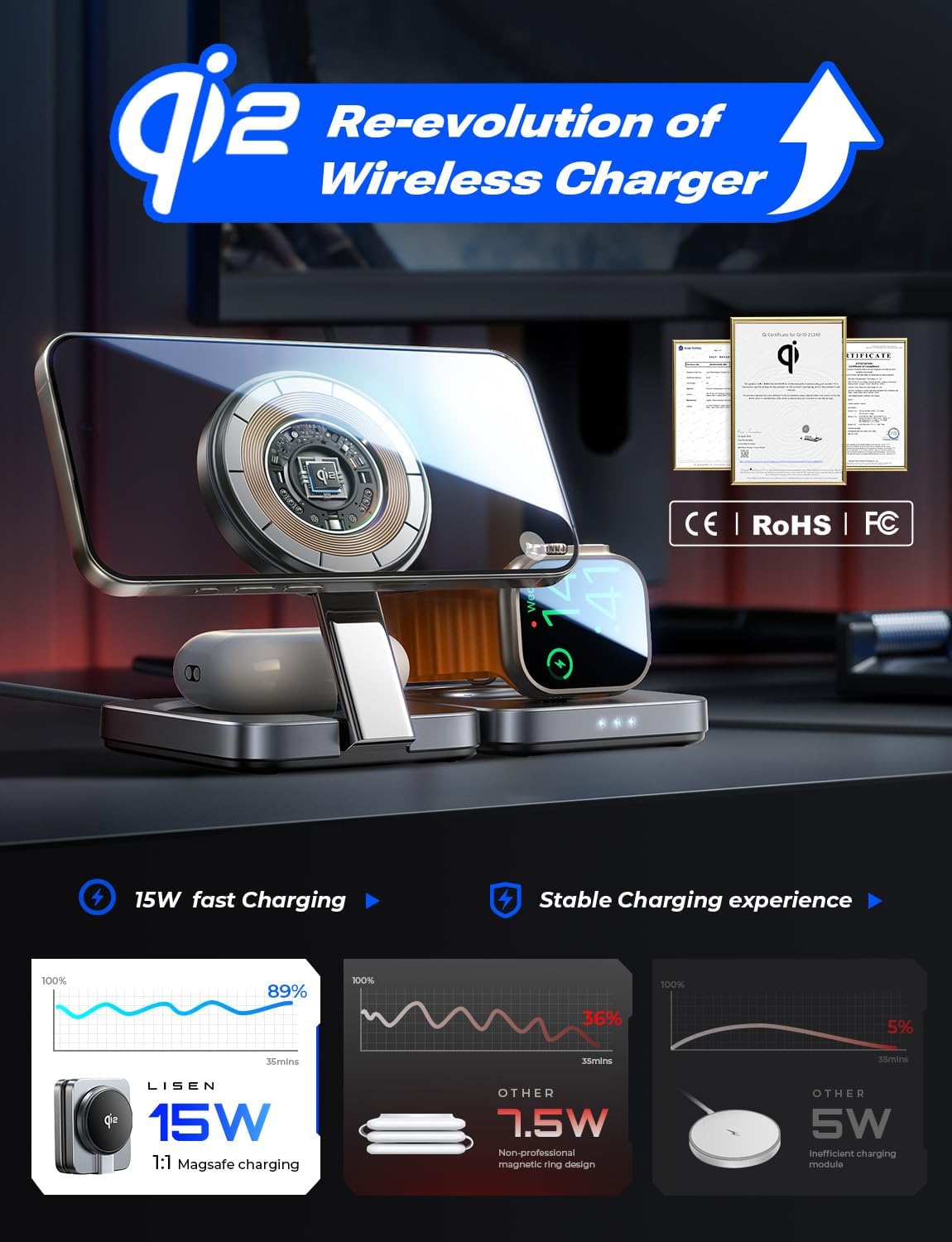 Qi2 Certified Ultra Fast Charging: LISEN wireless MagSafe 3 in 1 charger station is Qi2 certified full, real 15W fast charging device; approved by Qi Specification Work Group in WPC2502 conference Qi v2.0 MPP 15W*. By using the included 30W PD fast charger block and 60W USB C cable, the charging power will be guaranteed as 15W
