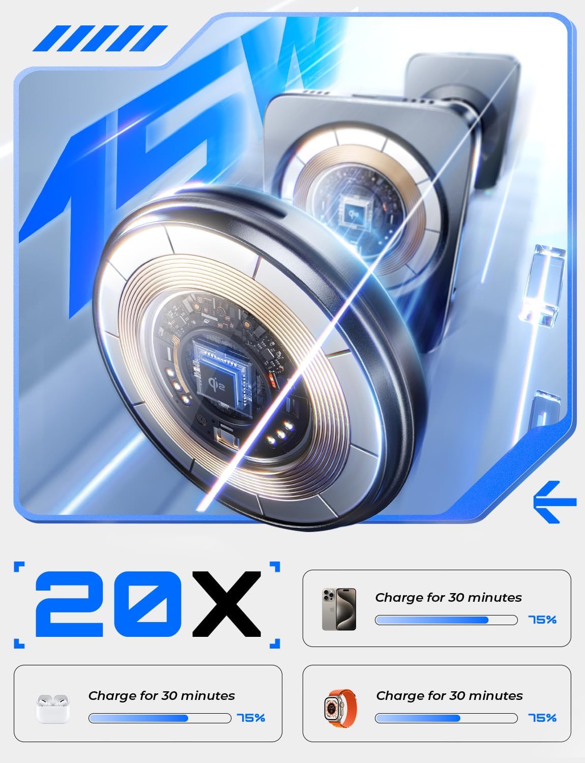 ULTIMATE MAGNETIC: 20X stronger magnetic attraction, precise alignment. Just put it down when you sleep at night, Qi2 Charger will stick to the charger easily. Developed for Apple magsafe, it will not fall off after being stuck no matter how you shake it. Magsafe portable charger’s precise magnetic attraction reduces energy loss and gives you super fast and stable charging experience