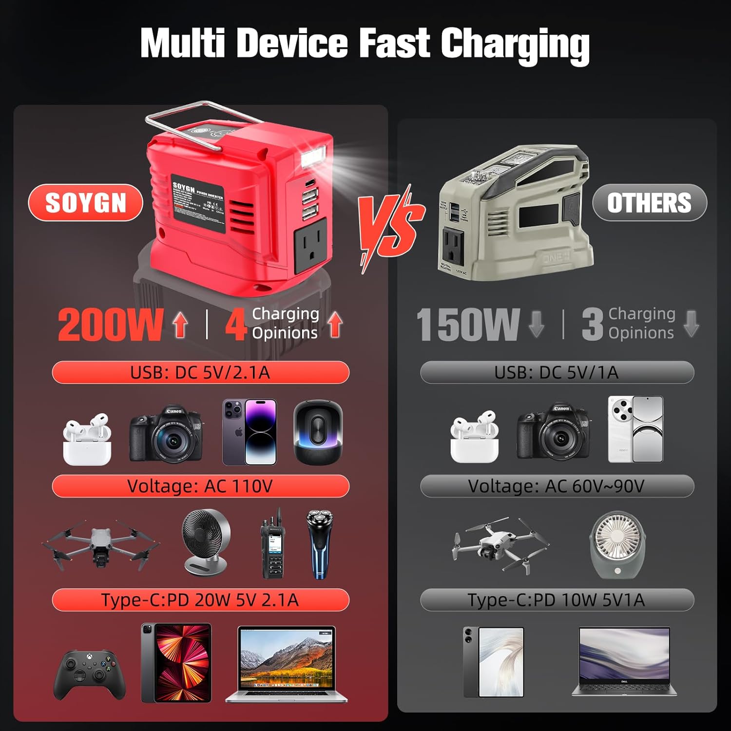 【Fast charging& versatile USB-C+ USB-A】 SOYGN power supply staion outlet inverter charge all your gear simultaneously! Features a 110V AC outlet PLUS 2 USB-A ports (5V/2.1A) and a 20W USB-C port for fast charging modern smartphones and tablets. Power your laptop via AC and fast-charge your phone/tablet via USB-C/USB-A at the same time. Ultimate convenience in one compact station.