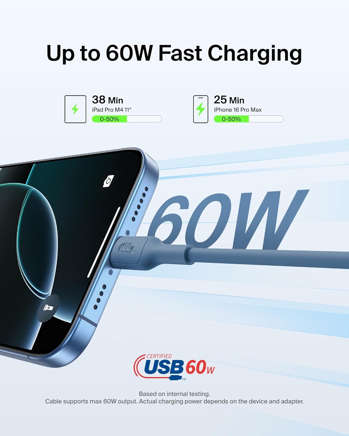*60W PD capacity allows for charging iPhone 16 from 0-50% in 25 minutes. Charge time varies with environmental factors; actual results will vary.