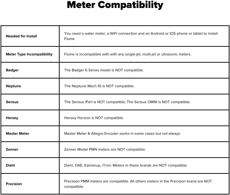 Needed for Install You need a water meter, a WiFi connection and an Android or IOS phone or tablet to install Flume Meter Type Incompatibility Flume is incompatible with with any single-jet, multi-jet or ultrasonic meters. Badger The Badger E-Series model is NOT compatible. Neptune The Neptune Mach 10 is NOT compatible. Sensus The Sensus iPerl is NOT compatible; The Sensus OMNI is NOT compatible. Hersey Hersey Horizon is NOT compatible. Master Meter Master Meter & Allegro Encoder works in some cases but not always. Zenner Zenner Model PMN meters are NOT compatible. Diehl Diehl, DAE, Kamstrup, iTron: Meters in these brands are NOT compatible. Precision Precision PMM meters are compatible. All others meters in the Precision brand are NOT compatible.