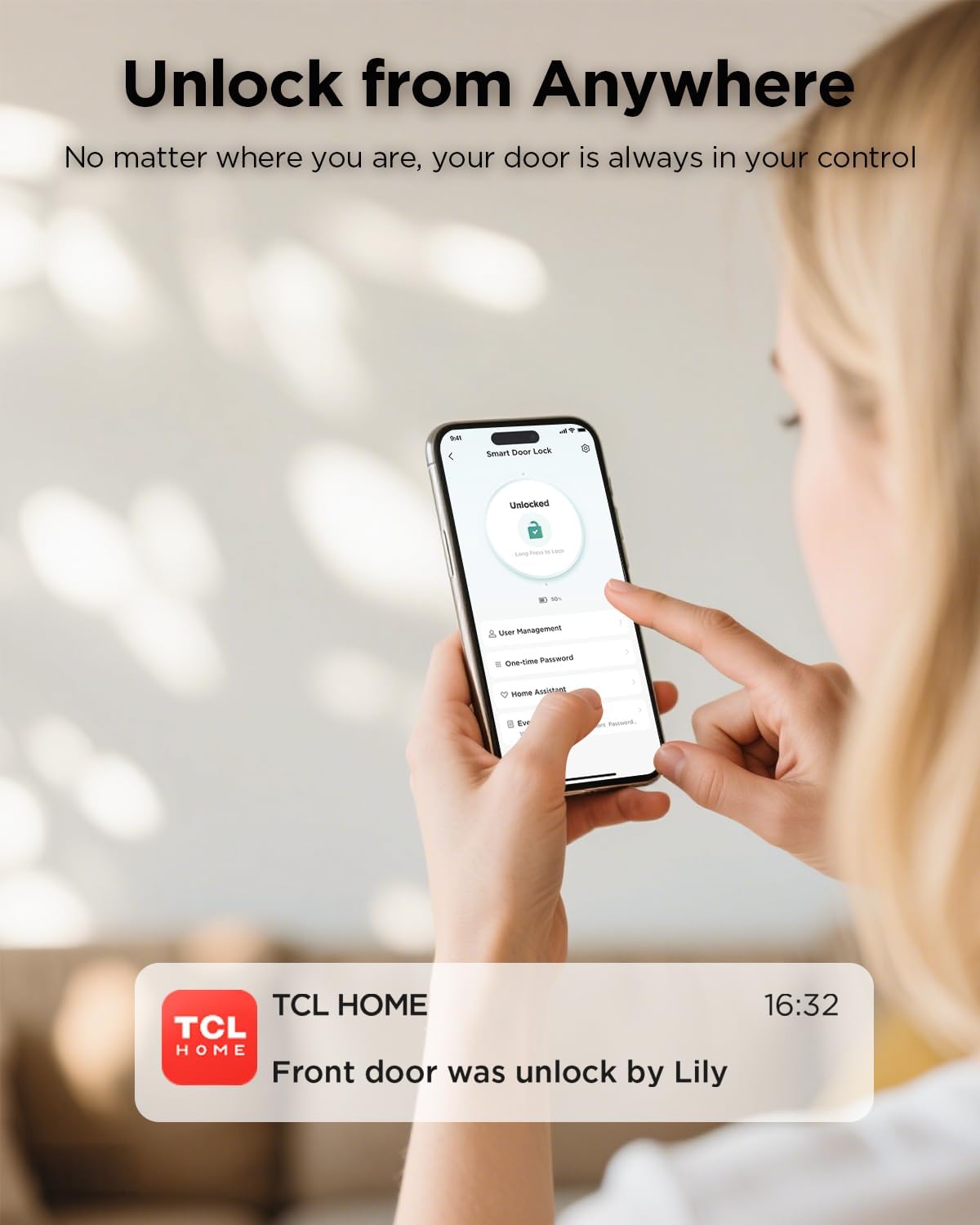 Real-Time Notifications & Remote Access : Stay informed with instant smartphone alerts whenever your door is unlocked. Control your smart lock remotely anytime via the TCL Home app, ideal for managing family members, guests, or delivery personnel with ease and peace of mind