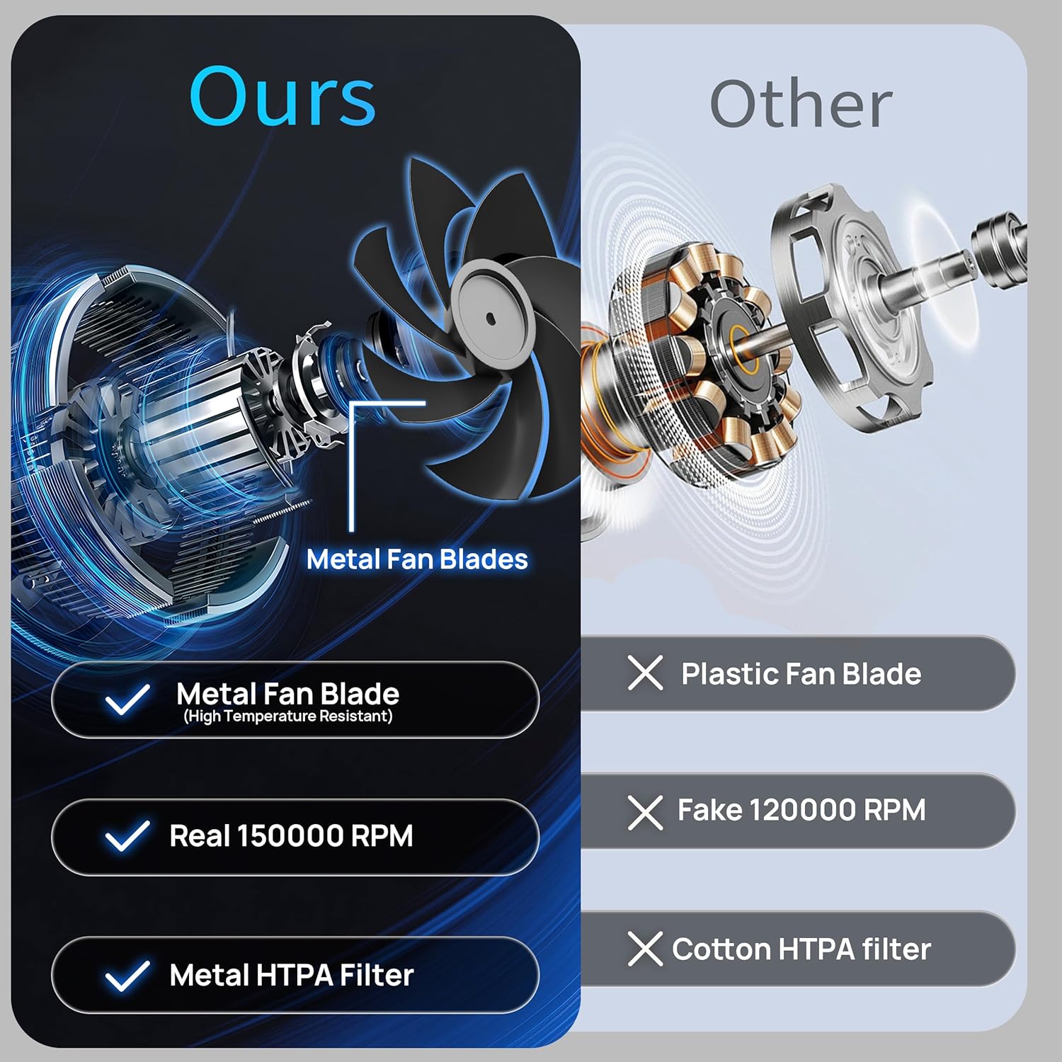 The handheld vacuum cordless has a brushless motor with two powerful gears that produce a suction of up to 16000kpa. It operates at speeds ranging from 100,000 to 150,000 RPM, effectively removing dust from any corner or space