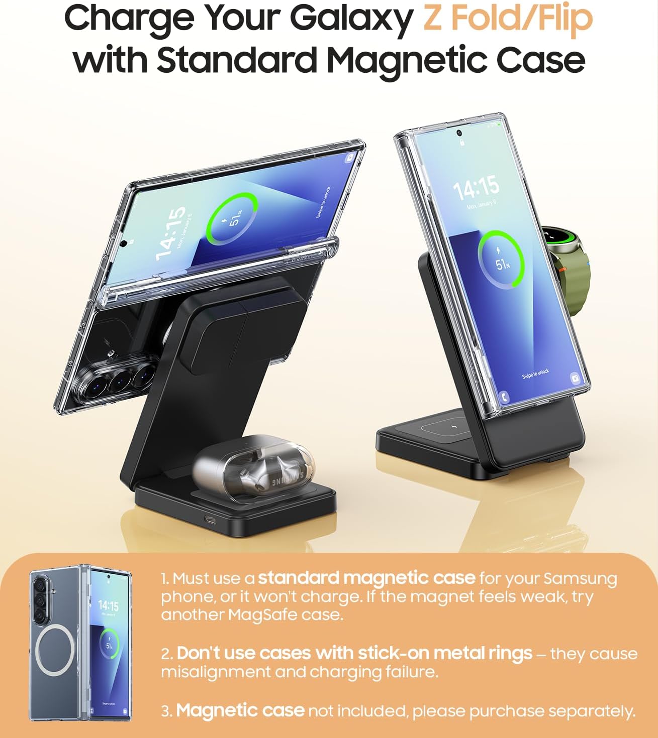 Magnetic Charging for Samsung Galaxy Phones: The cell phone charging area of this 3 in 1 wireless charger supports magnetic charging. Since Samsung phones do not support magnetic charging on their own, please use a magnetic case for charging your Samsung phone with our magnetic wireless charger. Don’t recommend using the following types of magnetic cases with our charger: 1. The magnetic case with a thickness ≥3mm; 2. Magnetic cases with a ring stand or metal ring on the back; 3. Magnetic wallet cases; 4. Magnetic battery cases; 5. Non-magnetic cases with a metal magnetic ring attached to the back.(Note: If your Samsung phone is not charging, please place another magnetic case.)