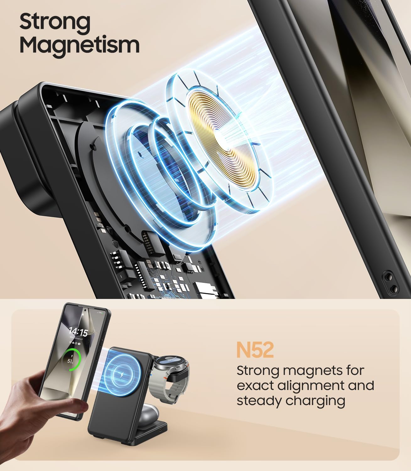 3 in 1 Fast Charger Stand:Our Mag Safe Wireless Charger is designed for Samsung devices. 3W Max for Galaxy Watch 8/Watch 8 Classic; Watch Ultra; Watch7; Watch6 Classic/6; Watch5 Pro/5; Watch4/4 Classic; Watch3(Not for Galaxy Watch (2018), GalaxyGear 1/2/live/S/S3/S2/S4/Sport; Galaxy Gear Fit/2/3/Fit e; Watch Active/2); 15W Max for Galaxy S25 Ultra/S25 Plus/S25/ S24 Ultra/S24 Plus/S24/S23 Ultra/S23 Plus/S23 /S22 Ultra/S22 Plus/S22/S21 Ultra/S21 Plus/S21; Galaxy Z Fold/Z Filp 7-1 series; Galaxy 20-S9 series; Galaxy Note 20-8 series and other phones that support qi charging; 5W Max for Buds. (For iPhone 12-16 series, it supports magnetic charging with the phone alone or with magnetic case)