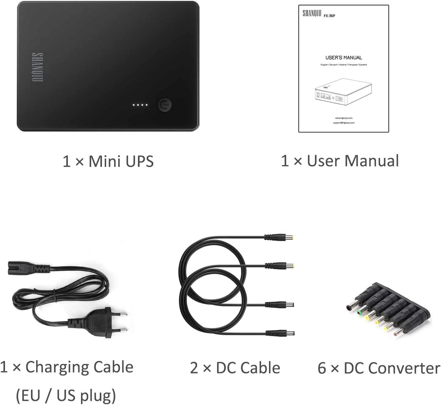1 × Mini UPS backup battery1 × AC cable2 × DC cable (5.5*2.5 & 5.5*2.1mm)6 × DC port converter1 × Multi-language user manual