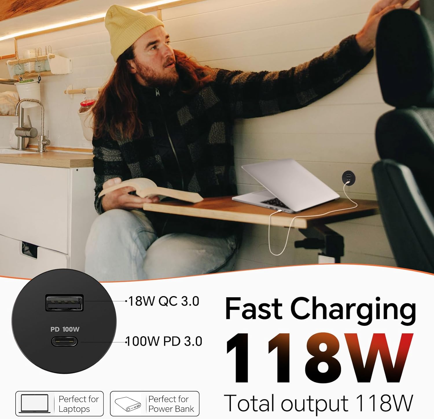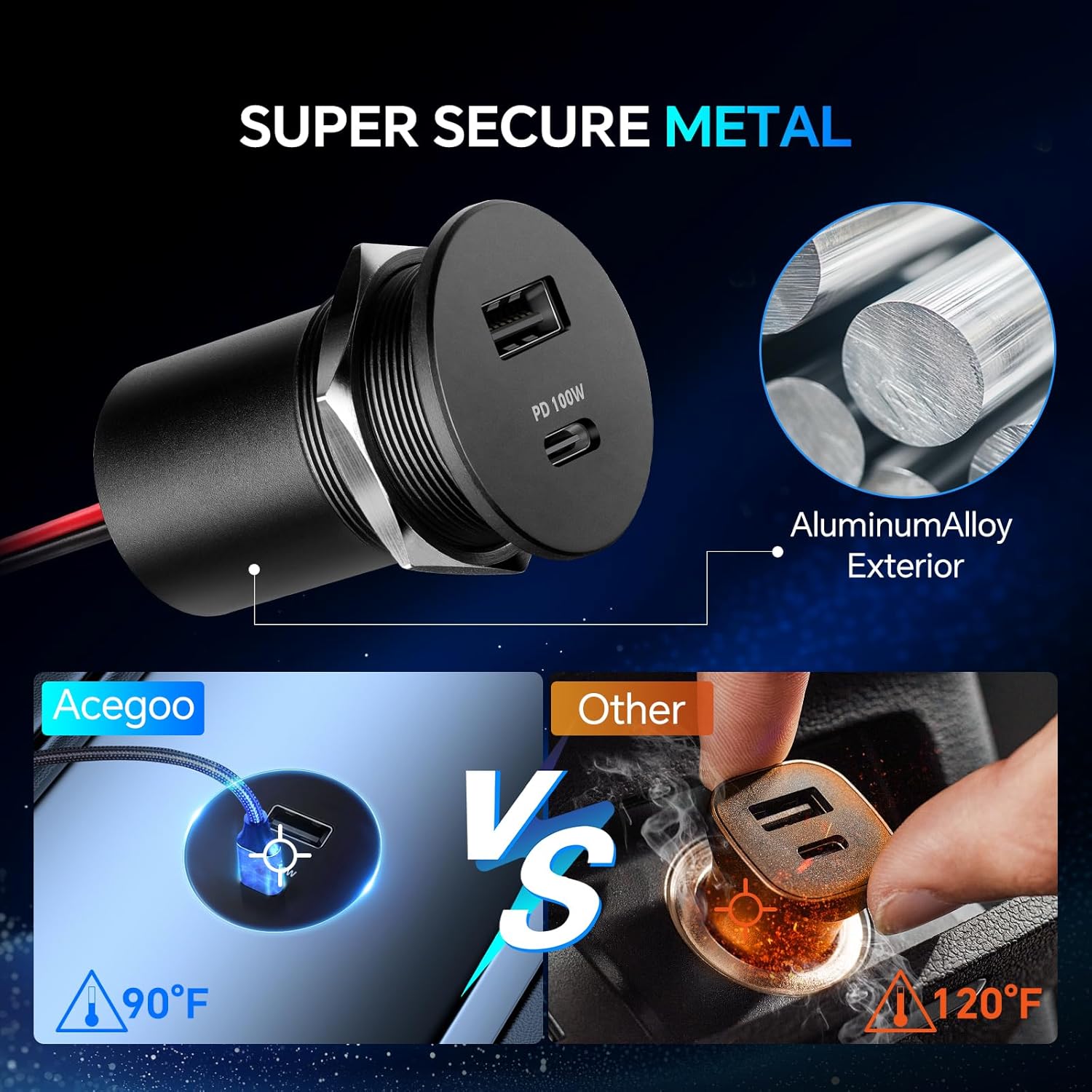 100W Ultra-Fast Charging: The Acegoo 12V USB Outlet is equipped with a blazing-fast 100W USB-C port, charging laptops from 0 to 40% in just 30 minutes—350% faster than standard 30W chargers. It’s perfect for high power-hungry devices like power banks, laptops, and drones. Say goodbye to long waits when you’re on the go