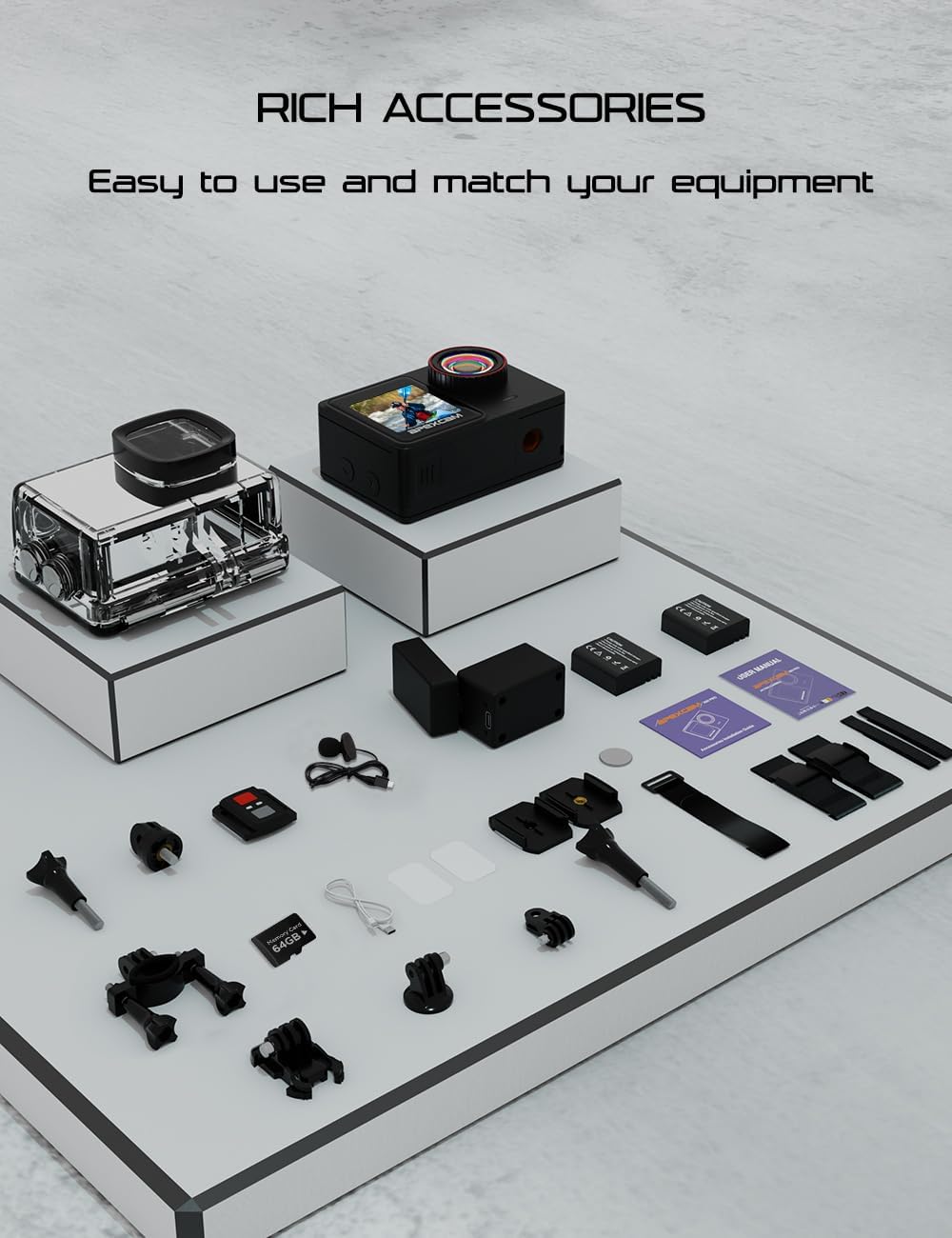 Long battery life: With a 2*1350mAh battery, the battery life can be extended to 60 minutes. This action camera gives you more time to explore and shoot. And it also comes with a free 64GB SD card, you don’t need to buy another one.