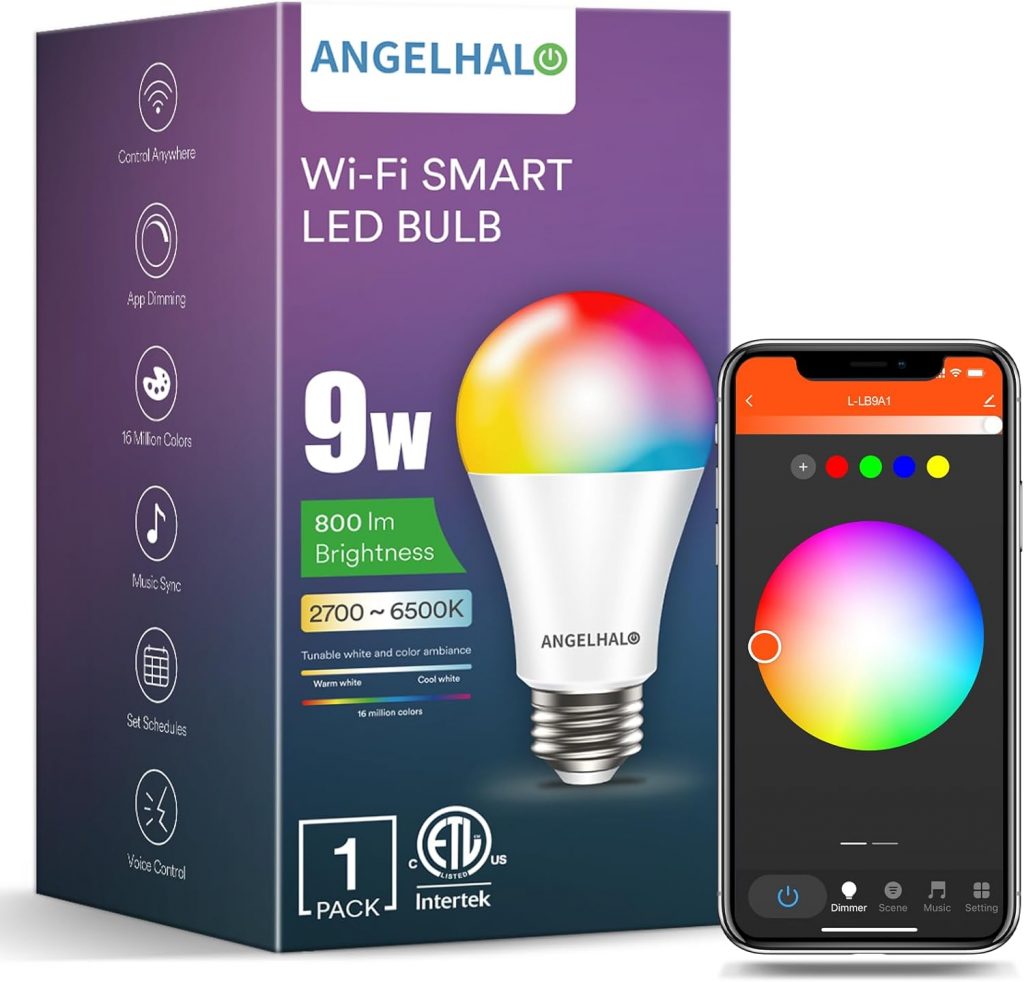 ANGELHALO Smart Light Bulbs, Color Changing A19 LED Light Bulb, Work with Alexa and Google Assistant, Wi-Fi & Bluetooth Light Bulbs, 16 Million Colors RGBCW, Music Sync, 800 Lumens, 2.4Ghz only,1 Pack